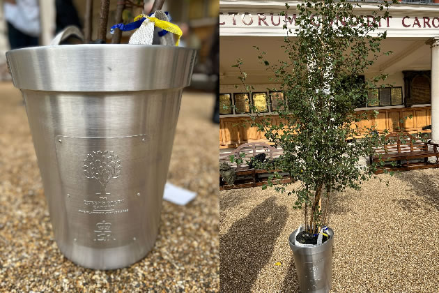 The special embossed pot in which the tree is place (left) and the tree. Picture: Queen’s Green Canopy