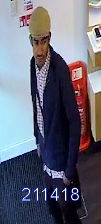 The suspect [ref: 211418] is described as a black man, aged in his 20s, with a black moustache. He was wearing a grey flat cap, a blue jacket over a chequered shirt, blue jeans and blue trainers with white soles.